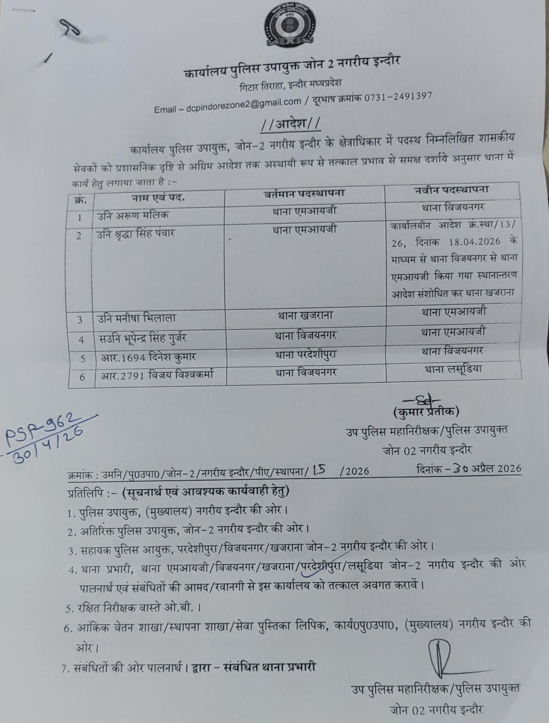 इंदौर। प्रदीप चौधरी। शहर की कानून व्यवस्था को और अधिक प्रभावी बनाने के उद्देश्य से पुलिस उपायुक्त (DCP) जोन-2 द्वारा पुलिस विभाग में व्यापक प्रशासनिक फेरबदल किया गया है। जारी आदेश के तहत विभिन्न थानों में पदस्थ उपनिरीक्षक, सहायक उपनिरीक्षक एवं आरक्षकों के कार्यक्षेत्र में तत्काल प्रभाव से बदलाव किए गए हैं।इस नई सूची में एमआईजी, विजयनगर, खजराना और लसूड़िया जैसे प्रमुख थाना क्षेत्रों के अधिकारियों और कर्मचारियों के तबादले शामिल हैं। आदेश के अनुसार उपनिरीक्षक अरुण मलिक को थाना एमआईजी से विजयनगर भेजा गया है, जबकि उपनिरीक्षक श्रद्धा सिंह पंवार का संशोधित तबादला कर उन्हें खजराना थाना पदस्थ किया गया है।इसी क्रम में उपनिरीक्षक मनीषा भिलाला को खजराना से एमआईजी, सहायक उपनिरीक्षक भूपेंद्र सिंह गुर्जर को विजयनगर से एमआईजी तथा आरक्षक स्तर पर भी कई बदलाव किए गए हैं।पुलिस प्रशासन का मानना है कि इस फेरबदल से थानों की कार्यक्षमता बढ़ेगी और कानून व्यवस्था को अधिक मजबूती मिलेगी। आदेश तत्काल प्रभाव से लागू कर दिया गया है। View this post on Instagram Share this:Tweet Email a link to a friend (Opens in new window) Email Share on WhatsApp (Opens in new window) WhatsApp PostMoreLike this:Like Loading... Related पोस्ट नेविगेशन अनाधिकृत अनुपस्थिति पर बड़ी कार्रवाई: प्रभारी नायब तहसीलदार मनीष बिरथरे निलंबित